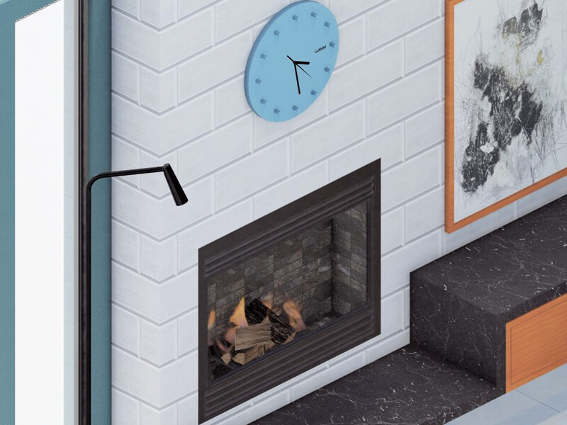 Looking for a sleek and contemporary fireplace design? Tiny Rooms is the perfect place to start your search. Fireplaces are available in a variety of shades to match your wood furnishings and create a stunning monochromatic effect. The black fireplace surround is sleek and adorned with a geometric pattern. The bookshelf next to it has similar designs, but with vertical and horizontal lines to accent the stylishness of the fireplace. The small decorative mirror on the mantelpiece reflects light upwards, adding to the cozy ambiance and creating a warm atmosphere. The light reflecting off of the mirror brightens up the room and makes it feel more welcoming.
