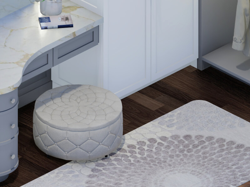 There is a current trend in closet design of creating storage solutions that make the most efficient use of space. This means that closets are being designed to maximize storage capacity while still remaining within the confines of the overall space available. This space has a contemporary look with a color palette that brings out the best in your home's existing interior spaces. The walls and ceiling are light-colored, and the flooring is high-gloss and polished. This chic and stylish closet is designed to make the most of your space, whether you have a small apartment or condo. We can make your closet dreams come true at Contemporary Closets with its rows and rows of shelving, plus a few fold-down racks, providing ample room for clothing of all types. Here you will find stylish clothing and accessories neatly displayed. Sleek and chic furniture completes the look.