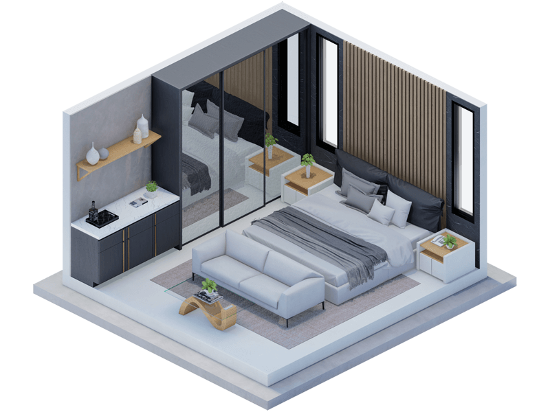 Mirrors add volume to your space. Plus, it’s a functional full body mirror which is also a decorative element. Add a touch of wood to the space to achieve the contemporary aesthetics you really want!