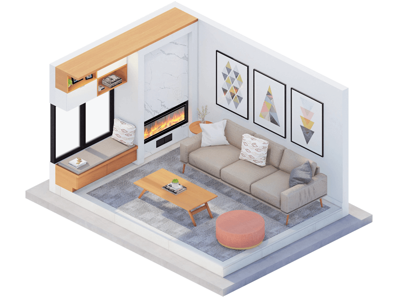 Looking for a sleek and Mid-Century Modern fireplace design? Tiny Rooms is the perfect place to start your search. Fireplaces are available in a variety of shades to match your wood furnishings and create a stunning monochromatic effect. The black fireplace surround is sleek and adorned with a geometric pattern. The bookshelf next to it has similar designs, but with vertical and horizontal lines to accent the stylishness of the fireplace. The small decorative mirror on the mantelpiece reflects light upwards, adding to the cozy ambiance and creating a warm atmosphere. The light reflecting off of the mirror brightens up the room and makes it feel more welcoming.
