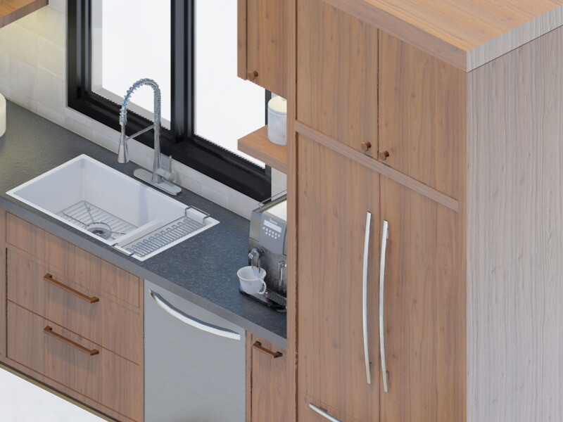 Wood paneling and wooden cabinetry create a cozy, homely feel, which makes the niche particularly attractive. It is a classic choice that will go with any scheme of contemporary designs.