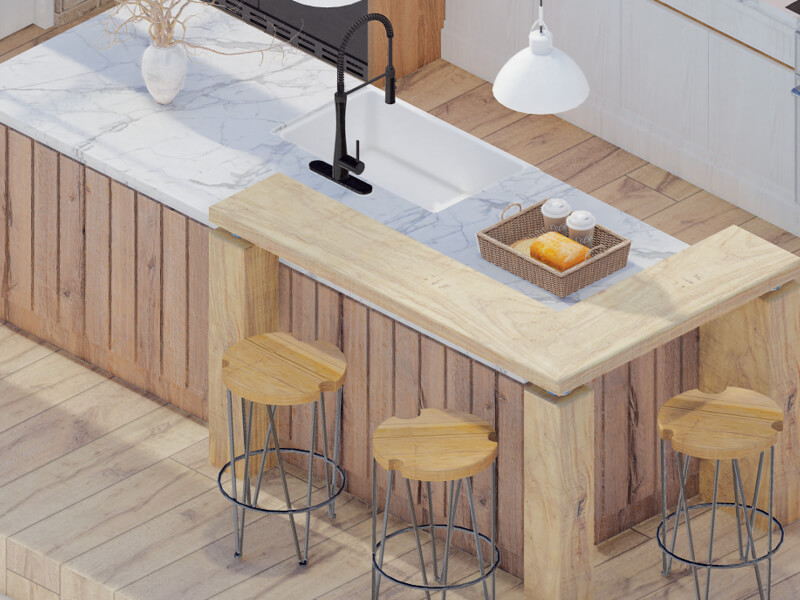 To unify the room’s style, this island matches the cabinetry, worktops, backsplash, and flooring, in its perfect way. Because of the wide variety of tile looks available, this ceramic kitchen island pulls all the elements of your kitchen together without compromising on style. It is the perfect way to upgrade your kitchen in both style and durability.