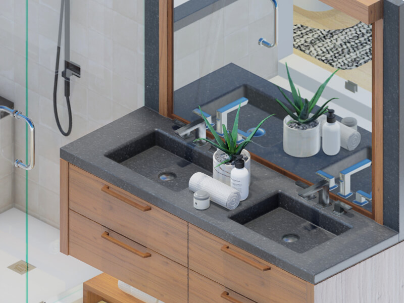 Bathrooms today are more than just a place to do your business. They are beautiful, serene retreats that can help you decompress from your daily routine. A space where you can be at peace is essential to your well-being. Your design is a refreshing and modern blend of flexibility, multi-functionality, and style. It features clean lines and layouts with pops of bold colors, as well as geometric patterns, flowing curves, and hard angles, which all add interest without being overpowering. The extra space in the bathroom has allowed us to create luxurious, custom-made vanities, storage towers, and mirrors that also double as artwork. If you are looking for a bathroom with a modern design, you have come to the right place!